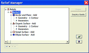 Как правило, пользователь имеет обыкновение в ходе творческого процесса менять свои идеи. Cистема, в которой он работает, не должна ограничивать полет художественной мысли. Следовательно, она должна обеспечивать возможность изменения предыдущих шагов построения. В системе Mastercam Art для этого существует так называемый Менеджер рельефов, где и "накапливается" вся последовательность действий (рис. 5). Там же предоставляется возможность доступа ко всем параметрам, определяющим форму рельефа и образующей геометрии.